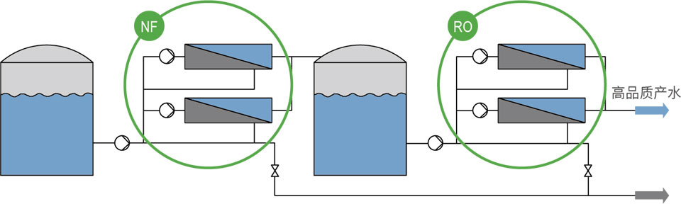 反滲透在脫鹽濃縮方面效果很好,最適宜稀溶液的濃縮,對濃度高的溶液處理受滲透壓和膜本身耐壓的限制,水回收率低,而納濾膜具有半脫鹽性能,可以讓單價(jià)離子部分通過(guò)而截流二價(jià)以上的離子,雖然納濾去除離子的能力不及反滲透,但是與反滲透相比,納濾具有操作壓力低,出水效率高、濃縮水排放少等優(yōu)點(diǎn)。如果把反滲透脫水和納濾結合起來(lái),各自發(fā)揮優(yōu)勢,既減少了工程造價(jià),回收率也比反滲透高,又減少了濃水的排放總量。